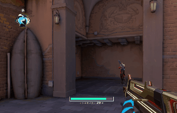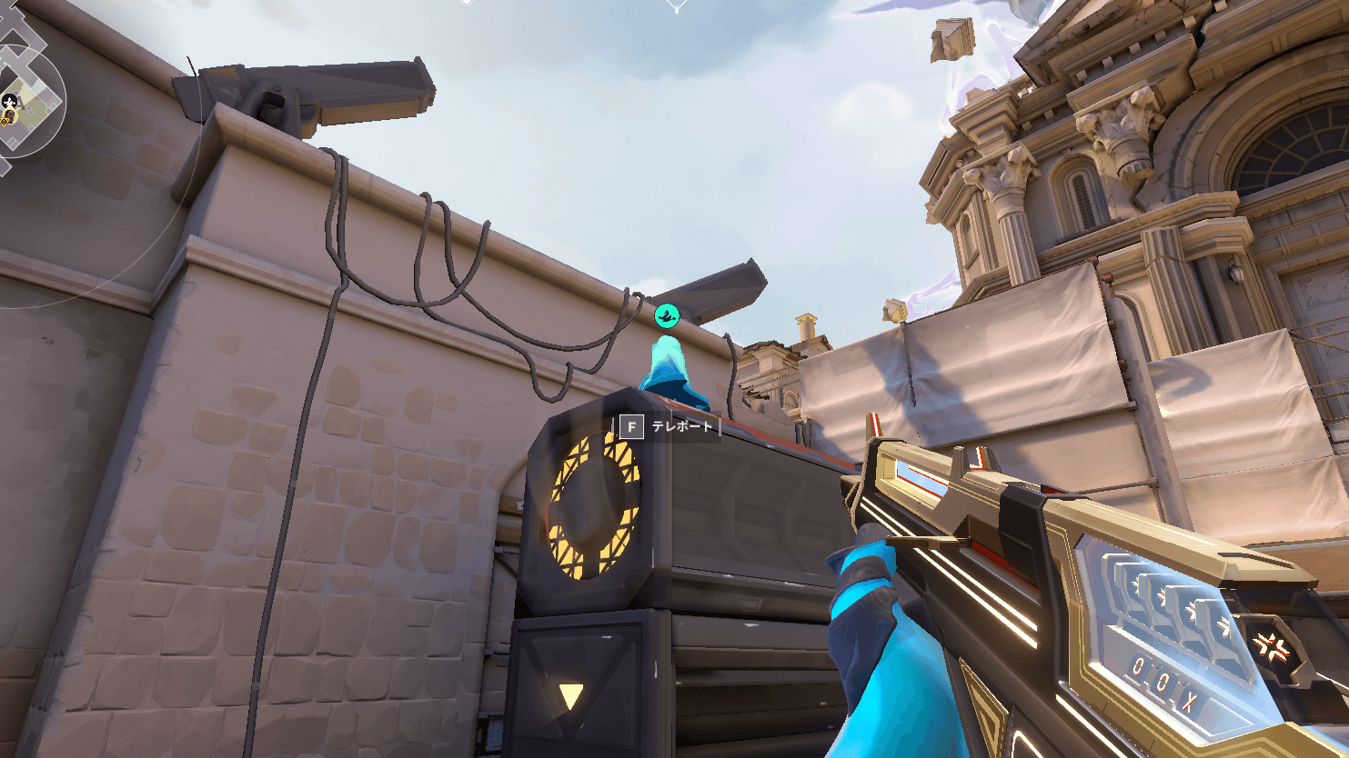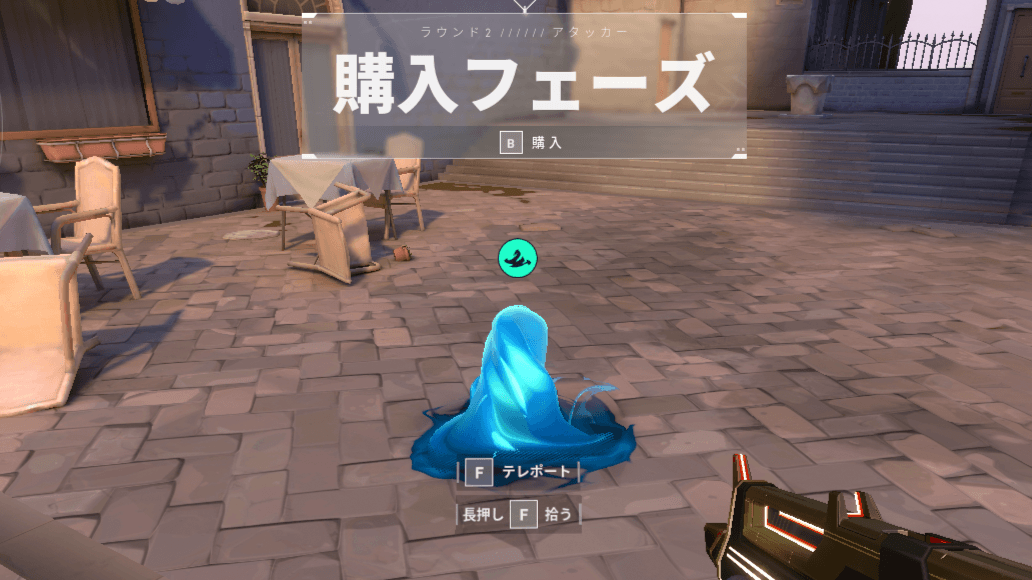 手に持った青い渦を、発射(左クリック)で地面に設置する。マップ上に円形の範囲が表示されるが、この範囲内でインタラクト[Fキー]を押すと、その渦のもとへとテレポートすることができる。なお、壁越しでもテレポートは可能だ。