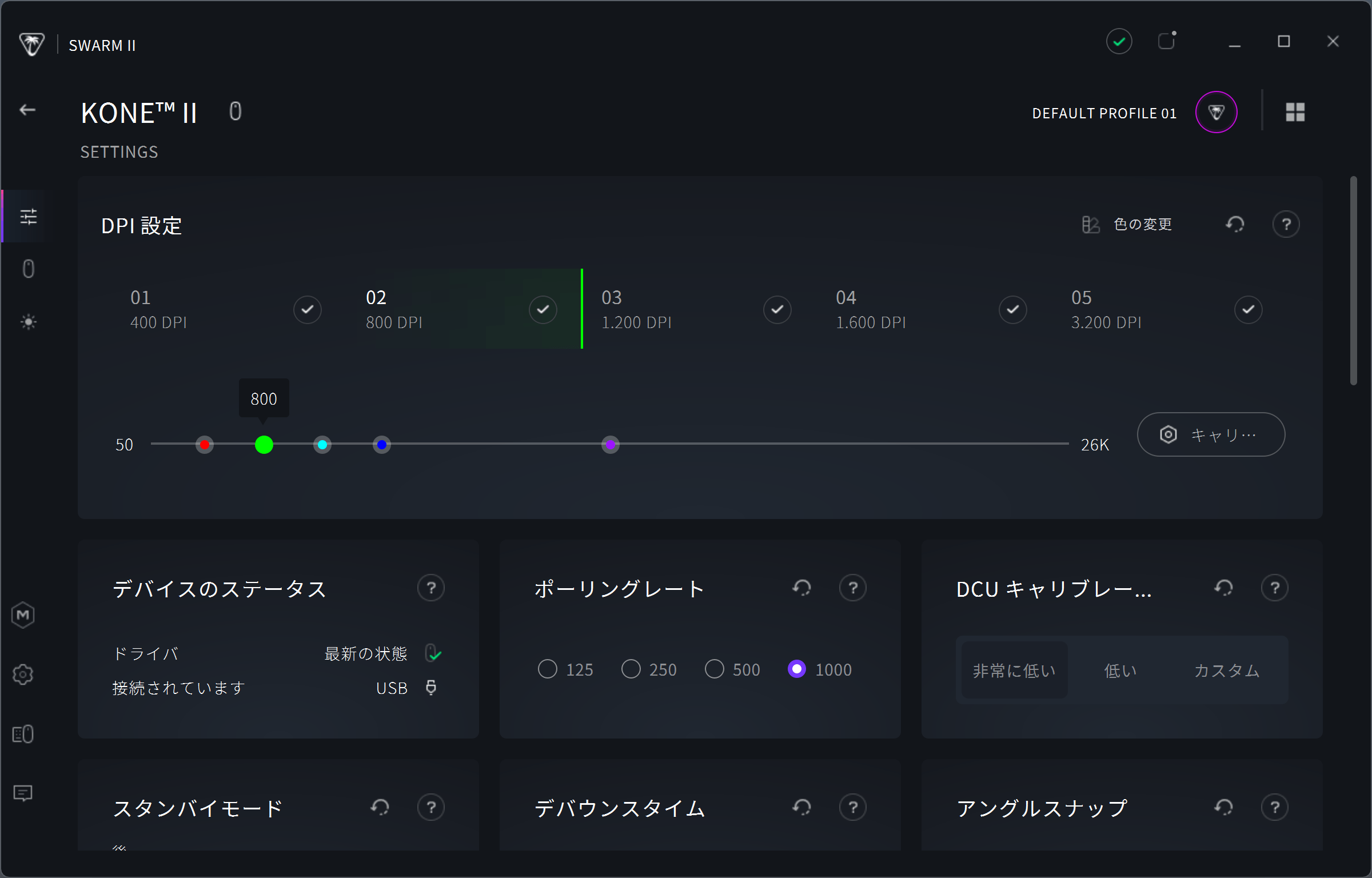 各マウスの設定ではDPIやポーリングレートの設定など、自分好みにカスタマイズすることができる。また、これらの設定は最大5つのプロファイルに保存が可能で、設定を書き出すこともできる。例えば別のPCで同じマウスを使いたいときは、その設定ファイルをもうひとつのPCにインストールした「Swarm II」経由でインポートすればOKだ。