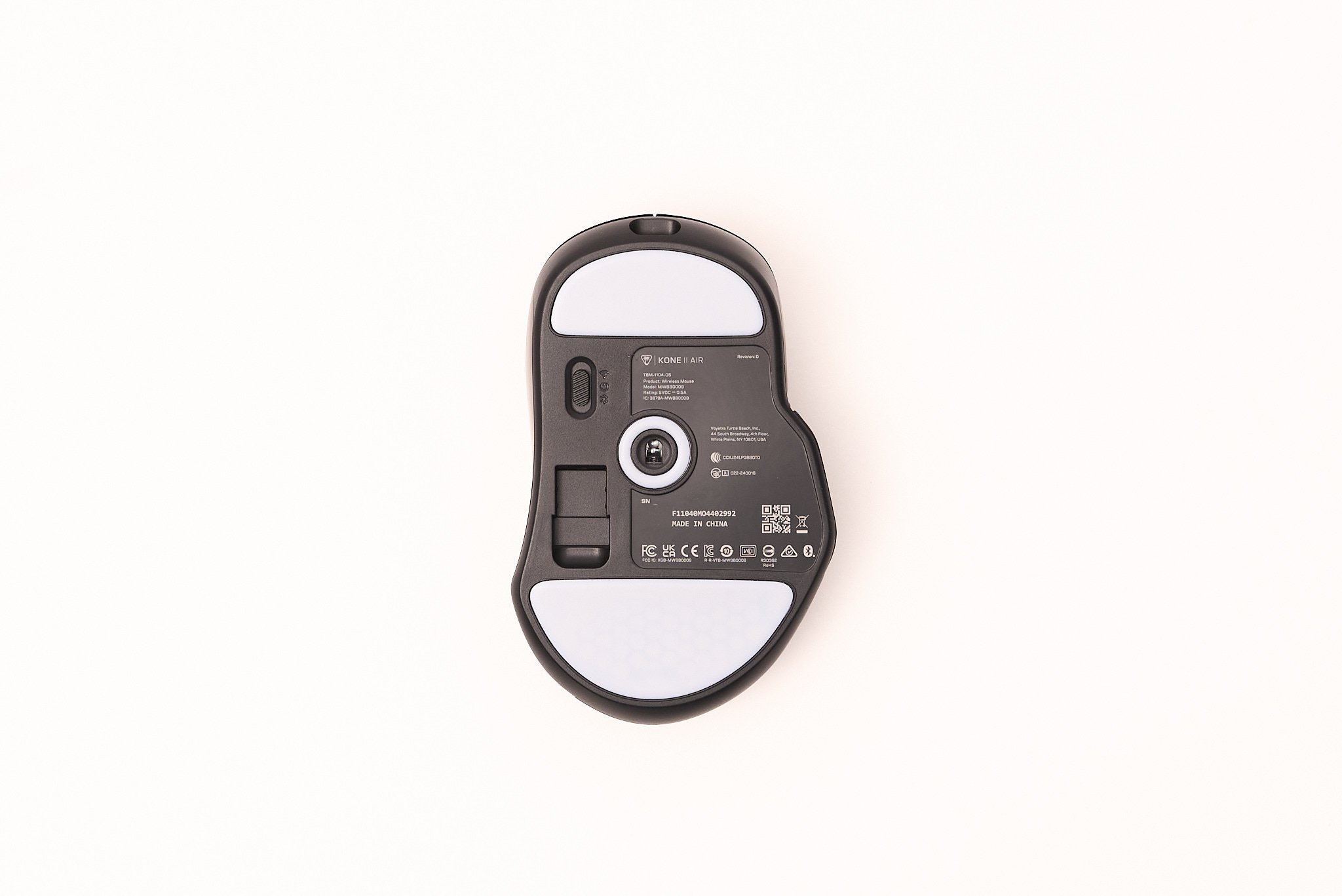 次に外観をチェックしてみよう。「Kone II Air」、「Kone II」ともにブラックとホワイトのカラー展開になっていて、表面はマット仕上げになっている。また裏面は3カ所にソールが貼られている。手にぺたりと吸い付くというよりはサラサラとした感触で手に馴染むといった質感だ。またソールは大きめなので重量の割にはしっかり滑ってくれる印象だ。
