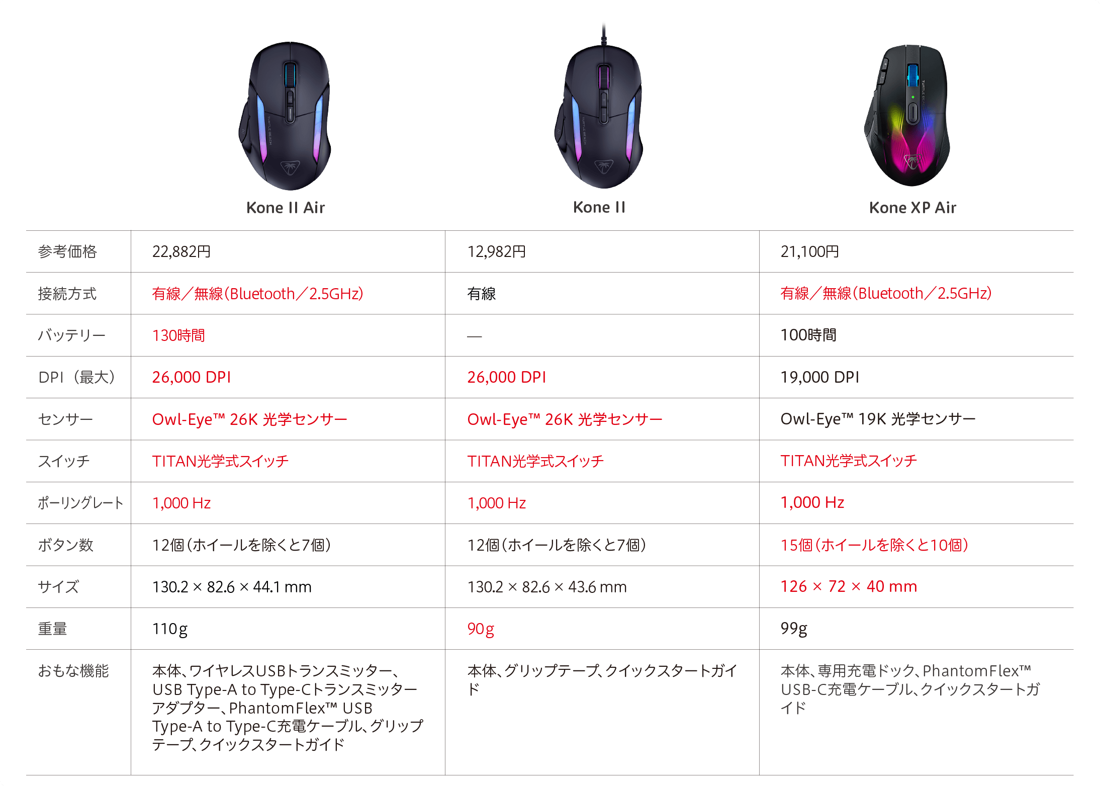 大きな違いはボタンの数、サイズ、重量、充電ドックの有無だ。結論から言えば、単純にボタンの数が多い方がよければ、「Kone XP Air」がおすすめ。逆に、より高性能センサーで、大きめのサイズ感がお好みならば「Kone II Air」、軽さと多ボタンを両立させたいなら「Kone II」を選択肢に入れるといい。