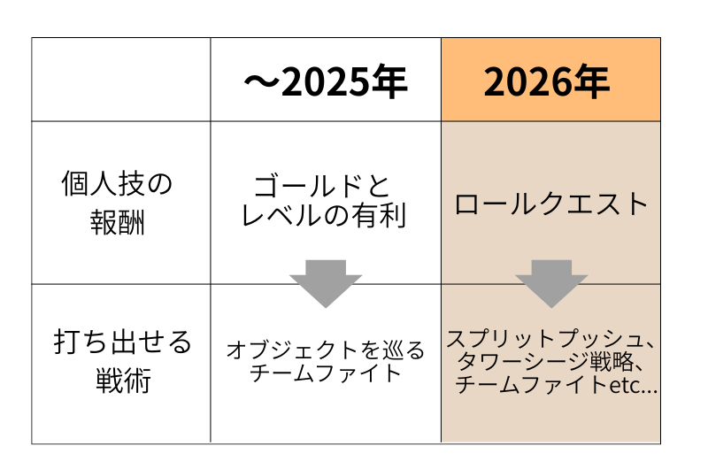 ゲーム序盤のレーン戦段階で個人技で相手を上回ったプレイヤーには、レベルやアイテムの有利といった報酬がありましたが、これらの有利を戦術として反映させる選択肢が少ない状態にありました。
