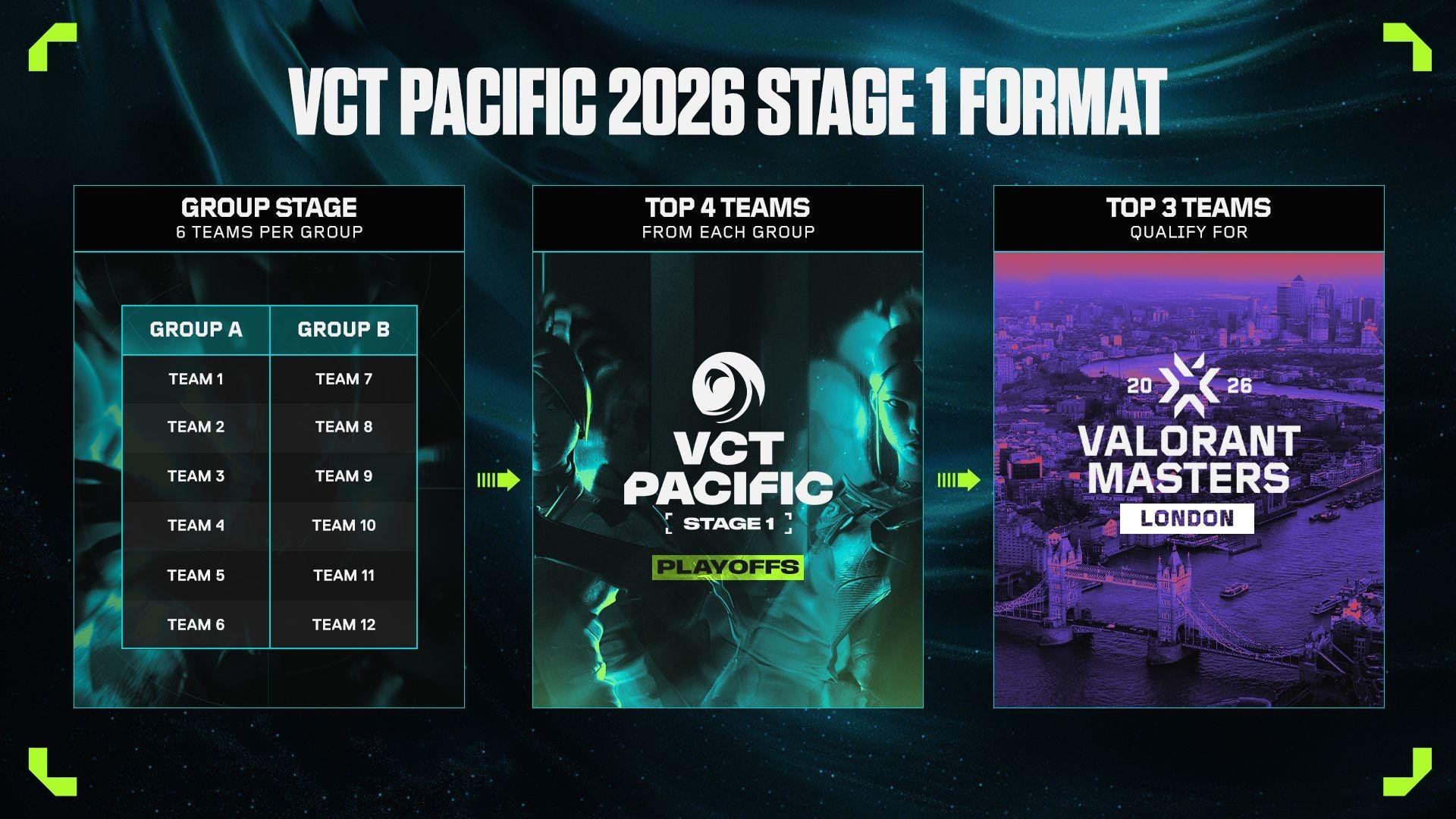 ▲VCT Pacific 2026 Stage 1の大会フォーマット。12チームから始まり、最終的に「Masters London」へ進めるのはわずか3チーム