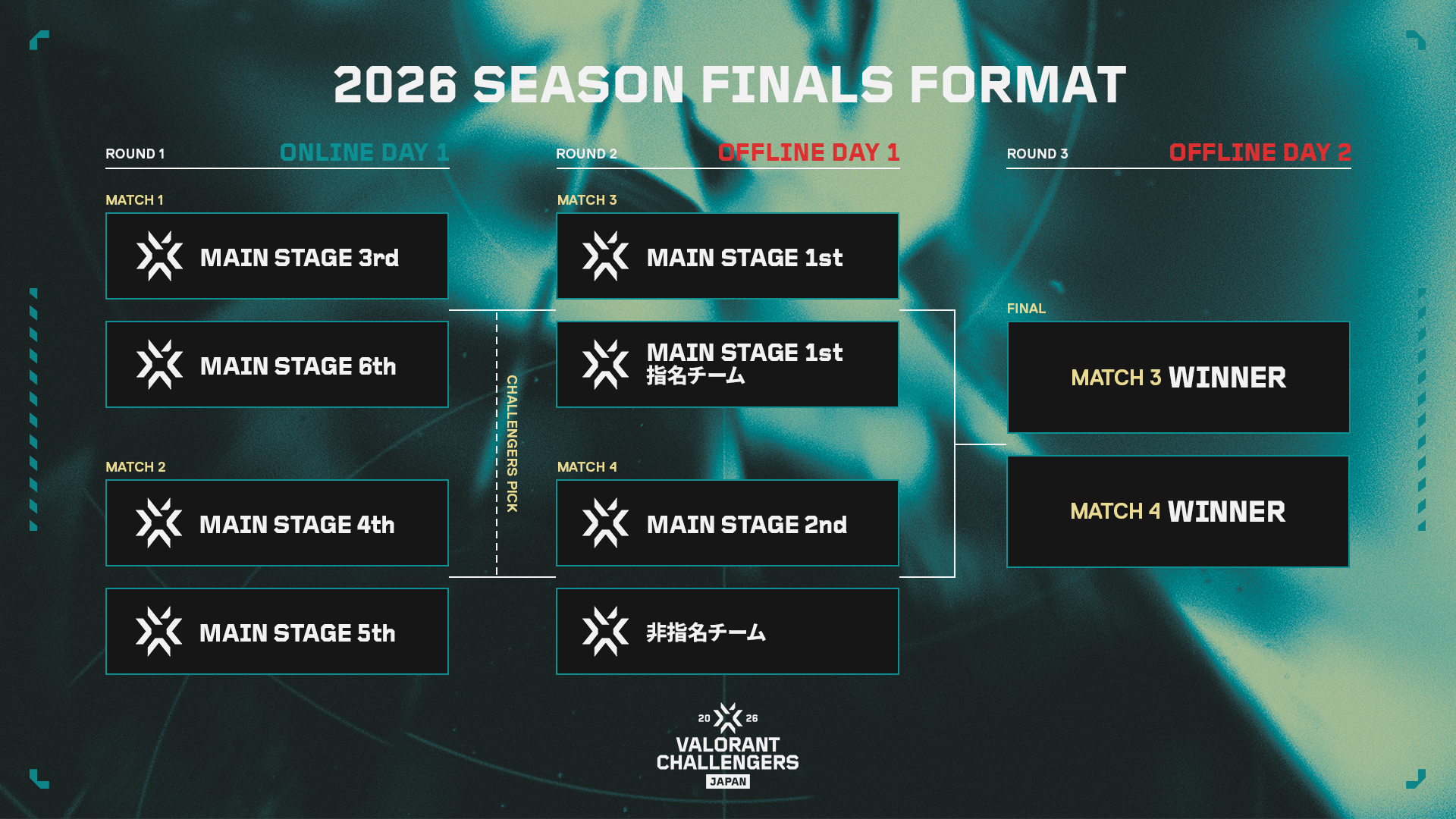 7月から開催予定の「Challengers Japan 2026」最後の大会となる「Season Finals」は、6チームによる変則トーナメント形式。まず4位〜6位のチームが対戦し、勝ち上がった2チームの中から「Split 2 Main Stage」1位通過のチームが対戦相手を指名。