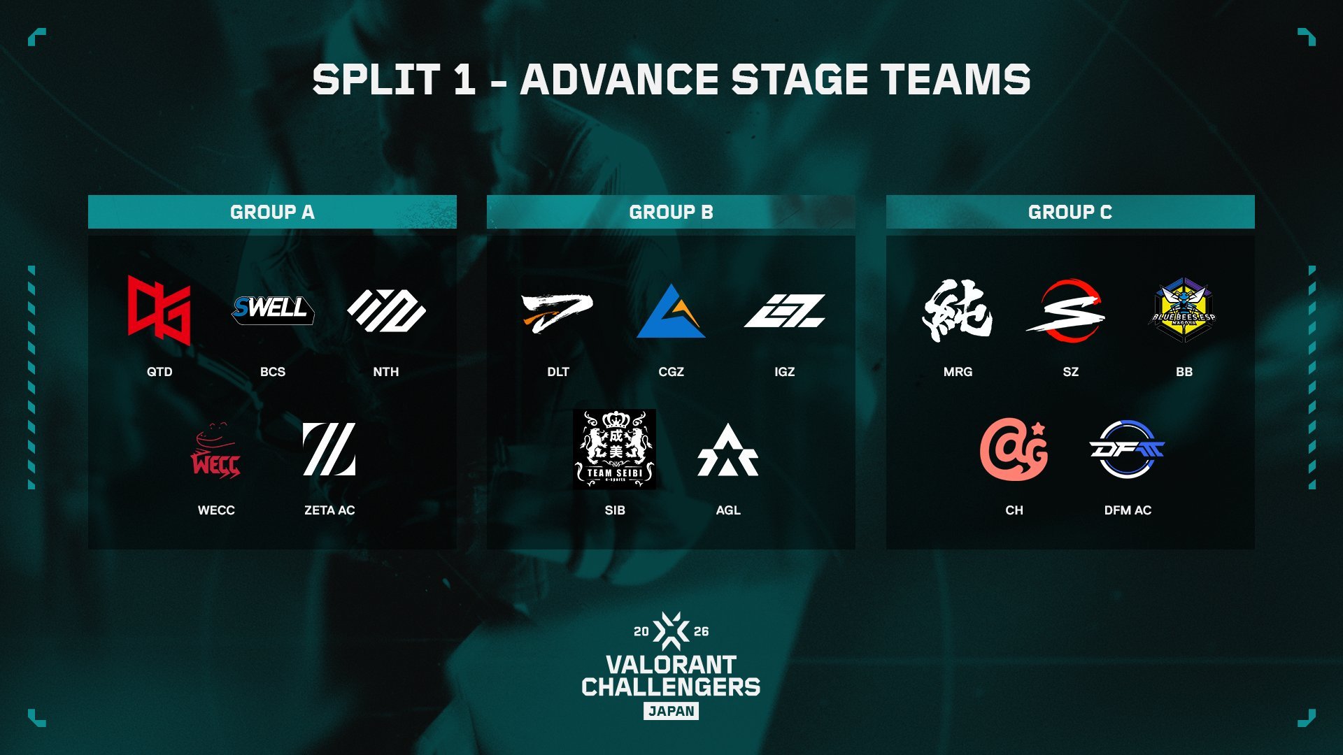 2月から開幕するSplit 1は、「Advance Stage」、2度の「Main Stage」、そして「Playoff」の4つで構成されている。2日(月)〜4日(水)の3日間で行われる「Advance Stage」では、昨年の「Challengers Japan 2025」サーキットポイント保有7チーム、Premier勝ち上がり4チーム、インターナショナルリーグ所属チームのアカデミー部門2チームの計15チームが出場する。