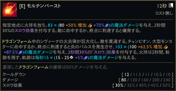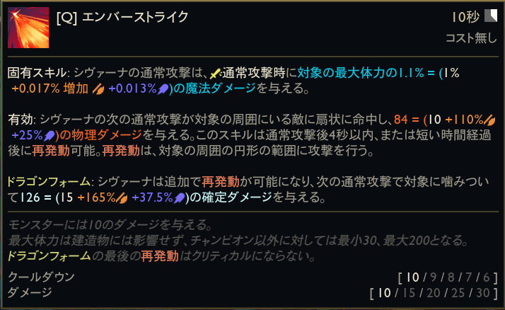 ドラゴン形態ではさらに強化され、再々使用も可能(つまり、3回も使うことができます!)。3回目のダメージはAD/APレシオを持つ確定ダメージと単体へ高火力です!