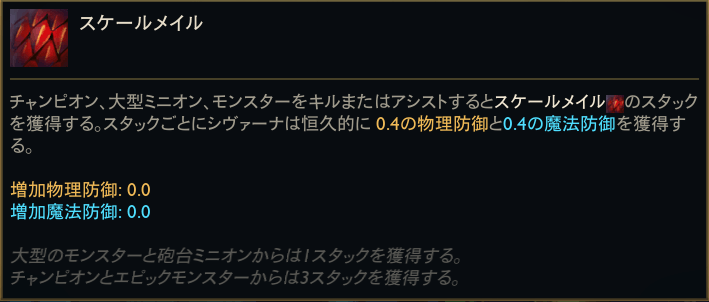 敵チャンピオンのテイクダウン、大型ミニオン、エピックモンスターへの関与でスタックを獲得。スタック数に応じて防御性能が上昇し、ジャングル以外でも価値を持ちやすい設計となっている。