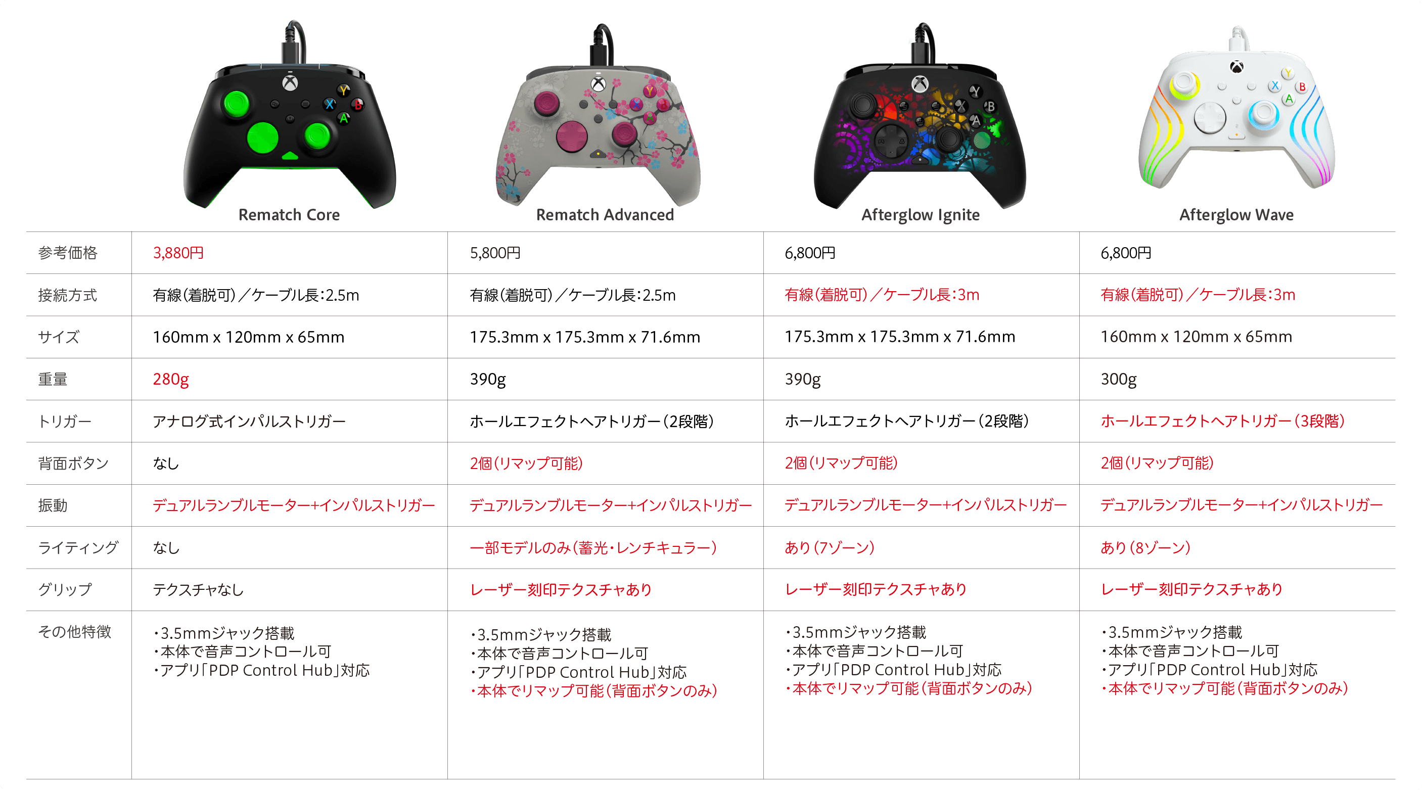 スペックは上記の通り。右に行くにつれて機能が充実していくといった感じだ。すべてのモデルにおいて、Xbox公認、着脱可能な有線モデルとなっている。内容物はどれも共通で本体とUSBケーブル(C→A)のみ。