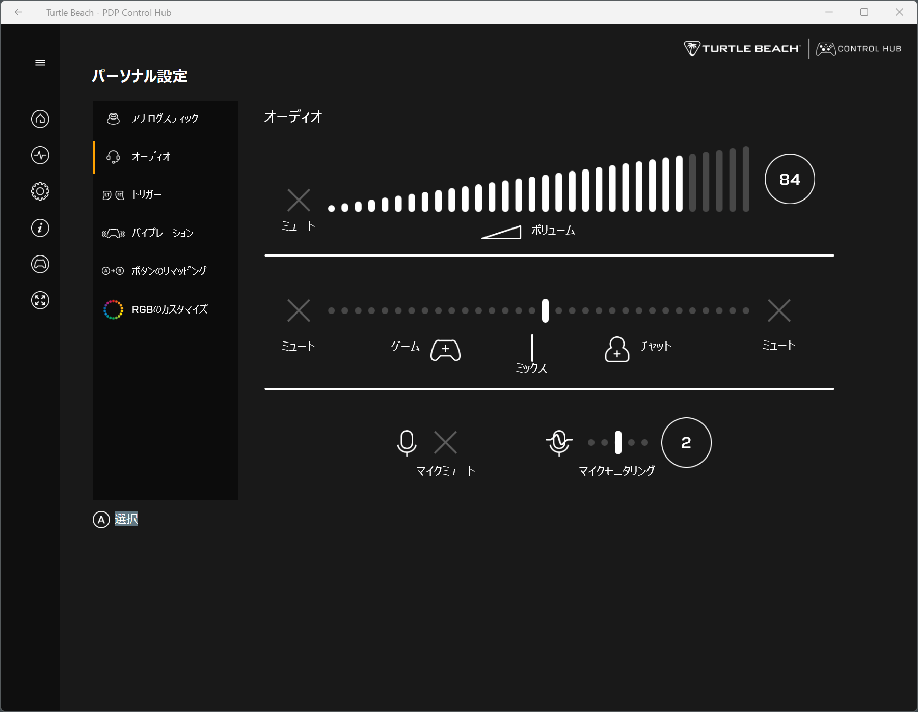 本体の3.5mmジャックに接続したヘッドセットのボリュームなどが調整できる。全体のボリュームや、ゲーム音とチャット音のバランス、自分の声をモニタリングする際の音量などが調整可能だ。