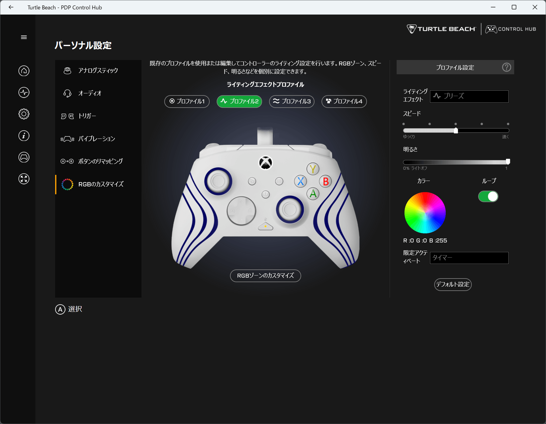 さらに細かいカラー設定は後述する専用アプリ「PDP Control Hub」で行える。