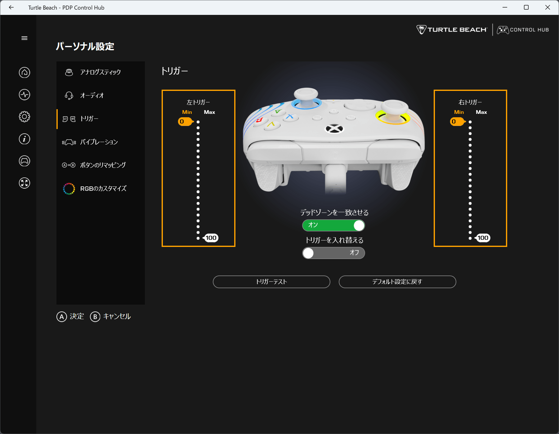 トリガーのデッドゾーンを調整したり、左右のトリガー操作を入れ替えたりできる。デッドゾーンは5%刻みで0〜100%の間で設定できる。なぜかマウスやキーボードで設定できないので、ゲームパッドで操作しよう。