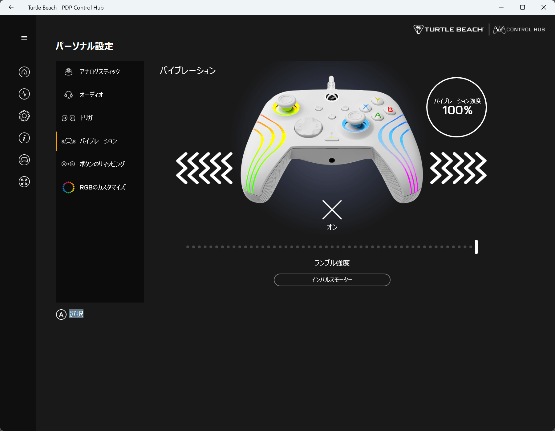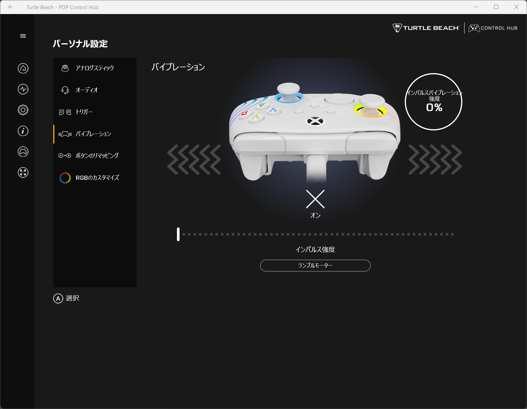 ランブルモーターとインパルスモーターの強度を設定できる。スライダーを調整するたびにゲームパッドが振動するのでお好みの強度で調整しよう。