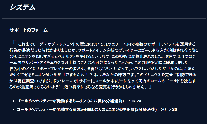 この戦術はサポートのセナが後半からCSを獲得することを前提にしていますが、これらのゴールドペナルティがネックとなっていました。突然CSからのゴールドが減らされてしまっては成立しない戦術なのです。