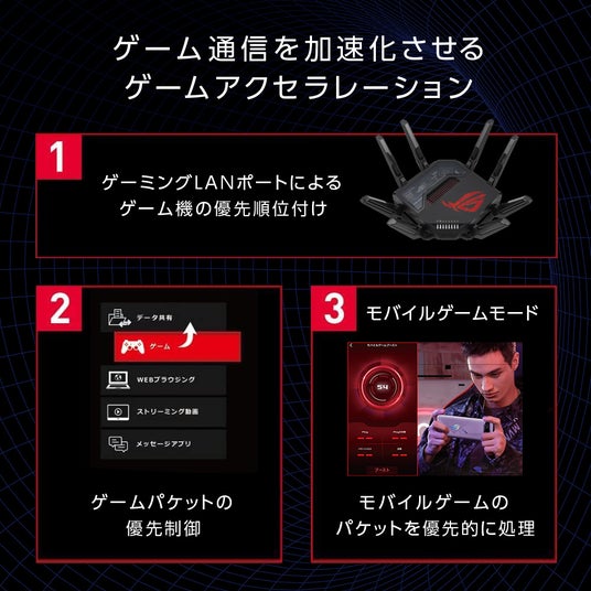 3段階のゲームアクセラレーション10GゲーミングLANポートやモバイルゲームモード、Adaptive QoSによりゲーミングが快適に。それぞれのゲーミングパケットを優先的に処理し、ラグや遅延のないスムーズなプレーを提供します。更に、オープンNATによりチャットや、マルチプレーヤー ゲームに参加して、ホストになることも可能です。