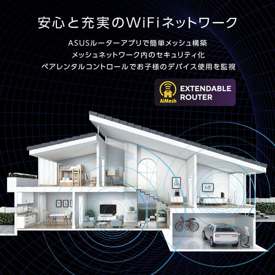 AiMesh複数のWiFiルーターを繋ぎ合わせて、隅々まで広い通信範囲を提供するメッシュネットワークシステムAiMeshに対応します。