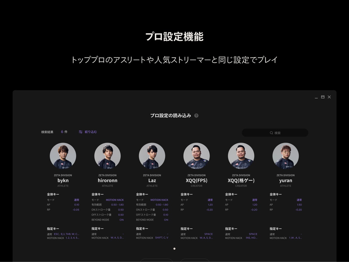 トッププロのアスリートや人気ストリーマーが使用している設定をプリセットとして用意しています。プロの設定を読み込み、同じ設定でプレーすることで、お気に入りのプレーヤーをより身近な存在に感じながらゲームに没入できます。また、プロの設定を参考にしてご自身の設定を最適化し、スキルアップに繋げていくことも可能です。