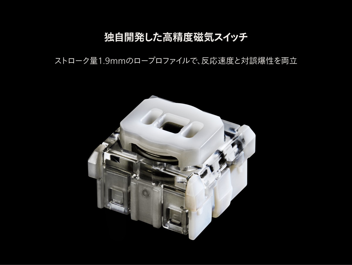トッププロと幾度となく試作を繰り返し、たどり着いた反応速度と対誤爆性を両立するストローク量1.9mmのロープロファイル磁気スイッチを搭載しております。