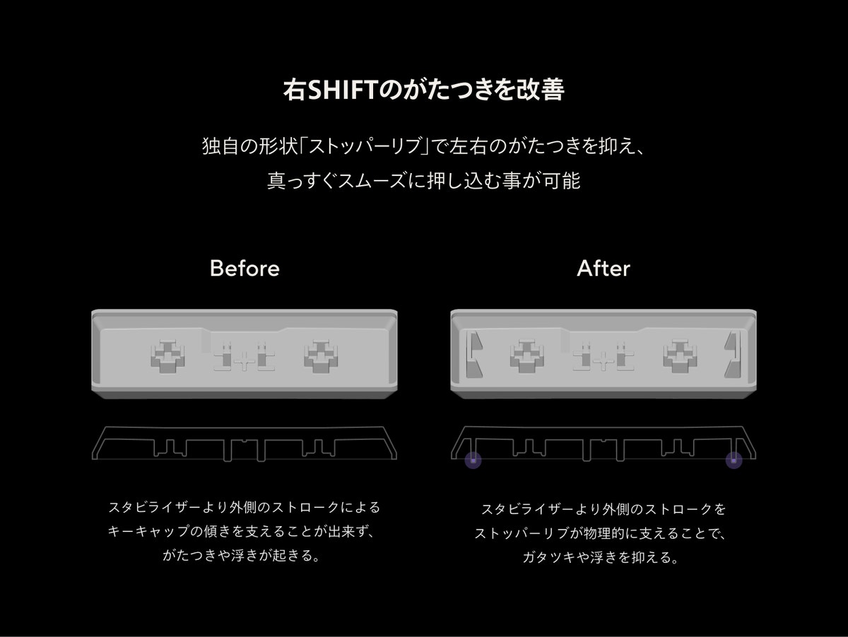 日常使いで使用する右SHIFT KEYをアップデートいたしました。一般的なUS配列キーボードの右SHIFT KEYのサイズは2.5Uサイズですが、スタビライザーは2.0Uサイズとなっているものが多く、それに伴ってスタビライザーより外側のKEY CAPの端を押し込むと、KEYCAP自体がスタビライザーから抜けてしまい、傾く事象が発生します。