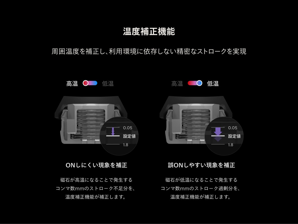 磁気検知式キーボードは、周辺温度によって、磁気が変化することで、その磁気の変化をセンサーが正確に読み取ることで、ストローク判定も変化してしまいます。したがって、 夏は設定数値よりも押し込みが必要になり、冬は誤ONし続ける可能性があるため、温度補正機能を搭載しております。 周囲温度を補正することにより、どのような状況下でも精密なストロークを実現します。