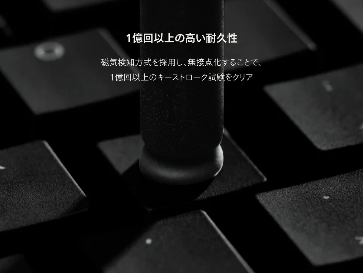 磁気検知方式を採用し、無接点化することで、スイッチの劣化を防ぎます。1億回以上のキーストローク試験をクリアしています。※試験は当社基準の試験評価によるもの