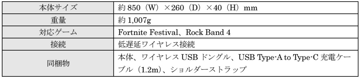 さらに、アナログスティックや付属のショルダーストラップを使用することで、好みのスタイルに合わせた自由な演奏が可能です。接続は有効範囲約9mの低遅延ワイヤレスに対応している他、大容量バッテリーによって1度の充電で最大約36時間使用することが可能です。