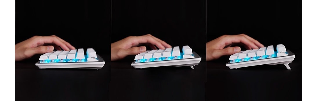 手の大きさや姿勢に合わせてキーボードの傾斜を6度・9度の2段階に変更できる、角度調整スタンドを搭載しています。キーボード内部にシリコン吸音パッド2枚、スポンジ吸音シート1枚の計3枚を搭載し、振動を抑制。不快な金属音が少ない軽快な打鍵音をお楽しみいただけます。