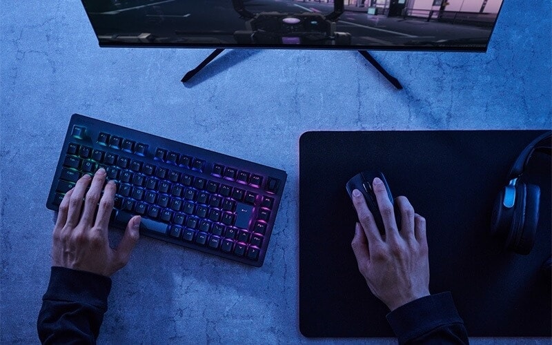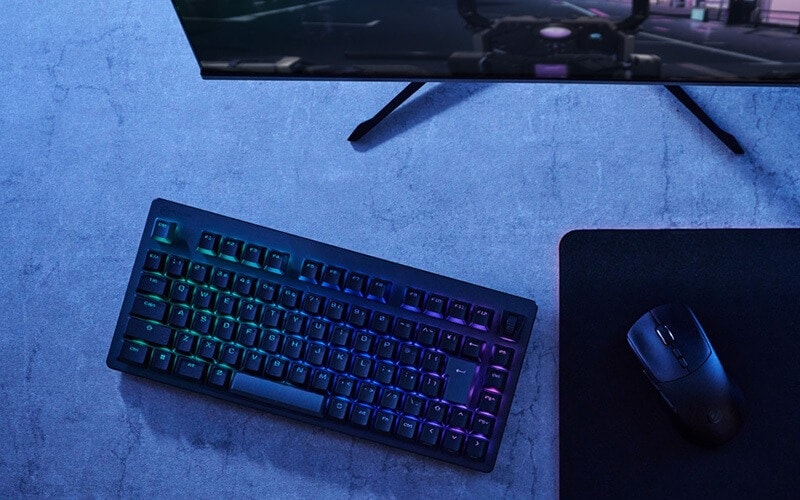 FPSなど高速な指の動きが求められるゲームに最適化された75%メカニカルゲーミングキーボードです。キーピッチはフルキーボードサイズを維持しつつ、コンパクト化を実現。マウス操作のスペースも確保できます。日本語配列を採用し、ゲームプレーとテキスト入力の快適さを両立。有線/Bluetooth®/2.4GHz無線の3接続方式に対応します。