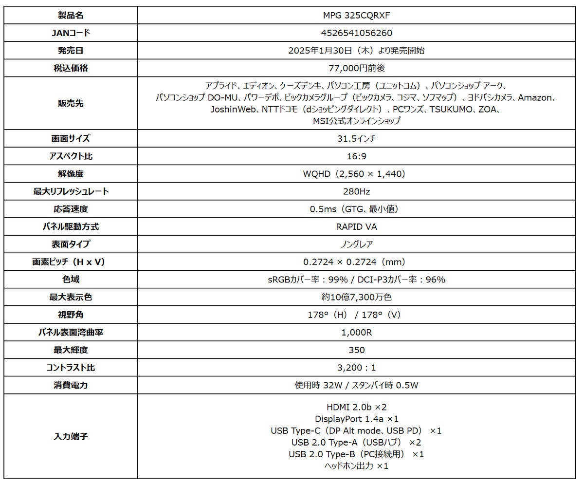 製品ページ:https://jp.msi.com/Monitor/MPG-325CQRXF