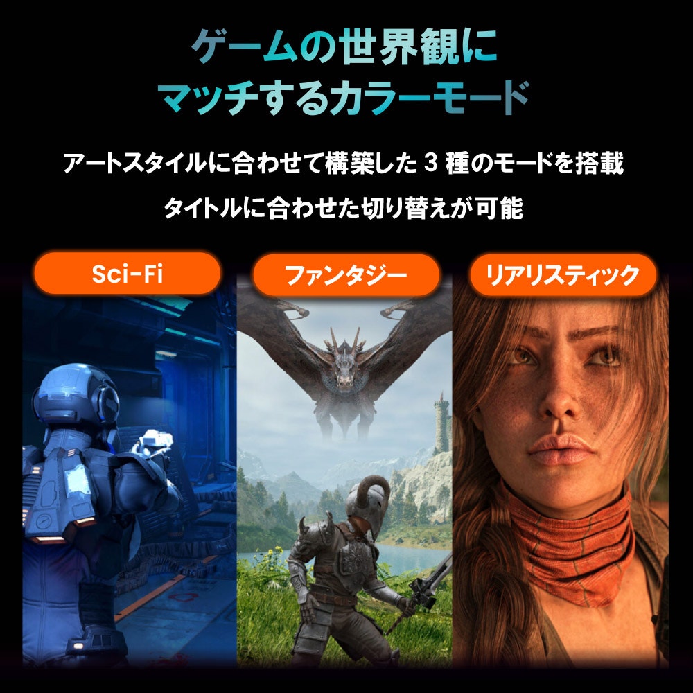 コントラストや色彩を最適化するAI搭載PixSoulエンジンを搭載しており、表示するコンテンツごとに最適な色味でゲームプレーが可能です。また、カラーモードではファンタジー、リアリスティック、Sci-Fiなど全15種類から選択可能なため、ゲームの世界観に適した映像を表示することができます。