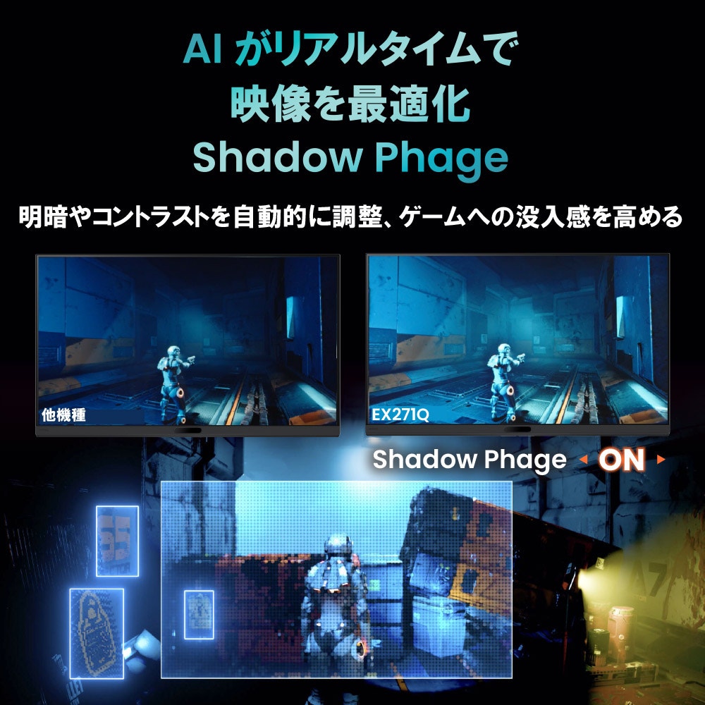 ゲームプレーヤーのさまざまなニーズに応えるべく開発したPixSoulエンジンを搭載「EX271U」は、PixSoulエンジンにより、パネルの状態に応じて輝度の自動調整や、色味の最適化を実現します。さらに、BenQ独自の「Shadow Phage」機能は、内蔵AIアルゴリズムが映像コンテンツを検出し、コントラストをリアルタイムで最適化します。これにより、暗部のディテールが鮮明に引き立てられ、明暗のバランスが調整され、臨場感のある映像を提供します。