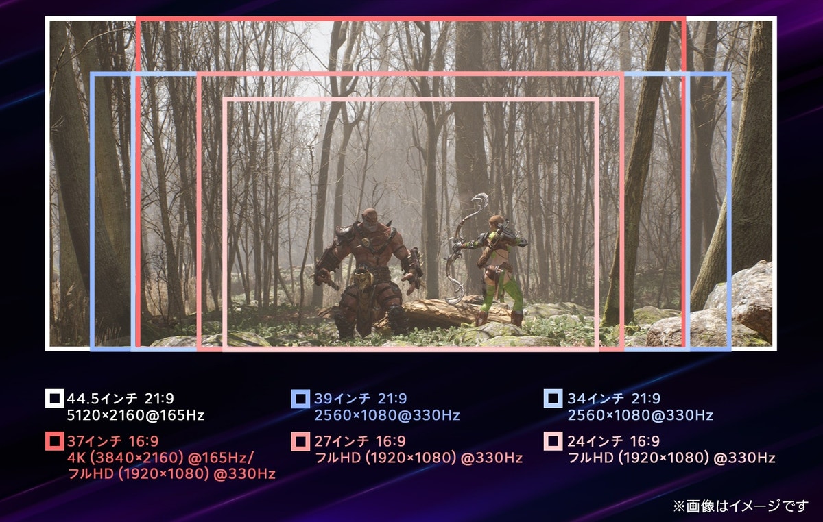 高精細な映像美を堪能し、高い没入感で楽しむゲームなら5K2K@165Hzを44.5インチ大画面で、高速な表示が求められ画面全体を一瞬で見渡したいFPSやアクションゲームならフルHD@330Hzを24インチで表示できるなど、ゲームジャンルや好みに応じて設定可能です。