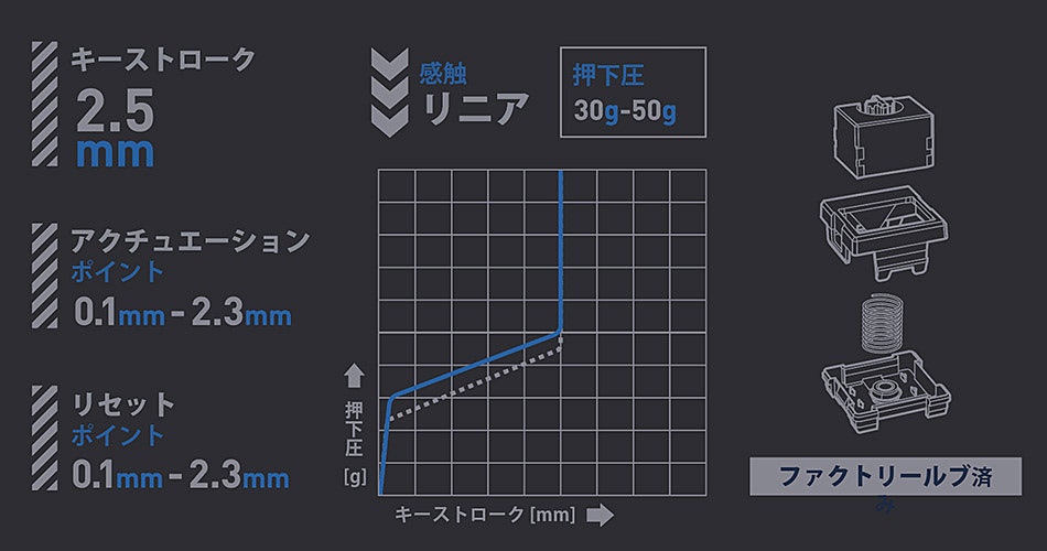 キーピッチ:19mm、キータイプ:磁気式アナログ検出スイッチ、キーストローク:2.5mm 、アクチュエーションポイント:0.1mm~2.3mm 、動作圧:30~50g