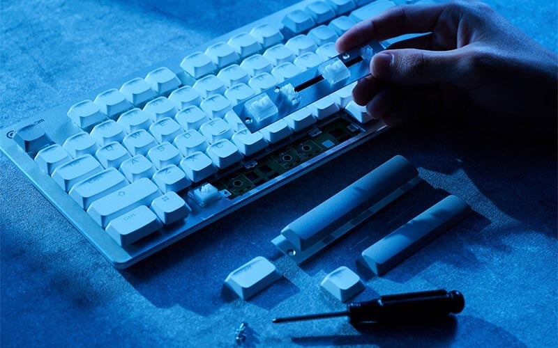 また、ホットスワップ方式によるキースイッチ交換やスペースキーのカスタマイズも可能で、スイッチはファクトリーブル済みで交換が簡単です。1,677万色RGBライティングを搭載し、専用ソフトを使ってキー割り当てやライティングのカスタマイズが可能です。