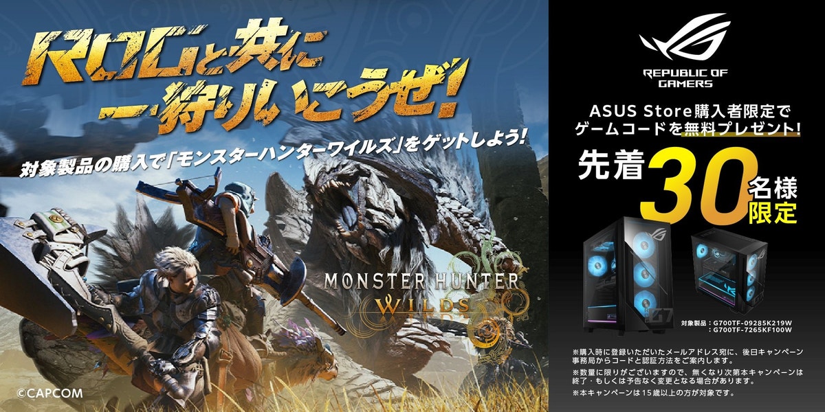 本製品の予約/発売を記念して、公式オンラインストア「ASUS Store」にて「ROG G700」シリーズを購入いただくと先着で「モンスターハンターワイルズ(通常版 / Steam版)」のゲームコードがもらえるキャンペーンを実施いたします。※ご購入先着順にて、別途メールにてゲームコードをご連絡させていただきます。