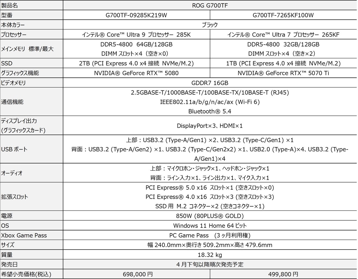 ASUS JAPAN株式会社は、ASUSのゲーミングブランド「Republic of Gamers(ROG)」より、圧倒的なグラフィックパフォーマンスを誇る新しいGPU、NVIDIA® GeForce RTX™ 5080、または、NVIDIA® GeForce RTX™ 5070 Tiを搭載した、ハイエンドゲーミングデスクトップPC「ROG G700」を1製品計2モデル発表いたしました。4月初旬より予約開始予定、4月下旬以降順次発売予定となります。