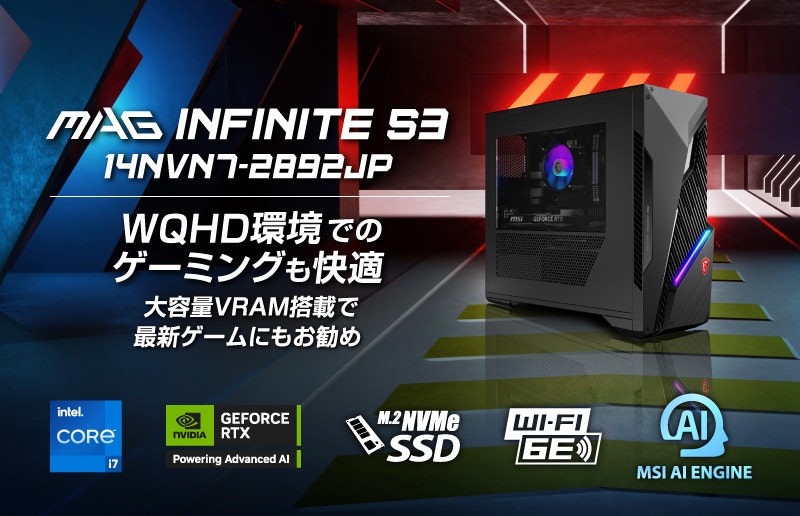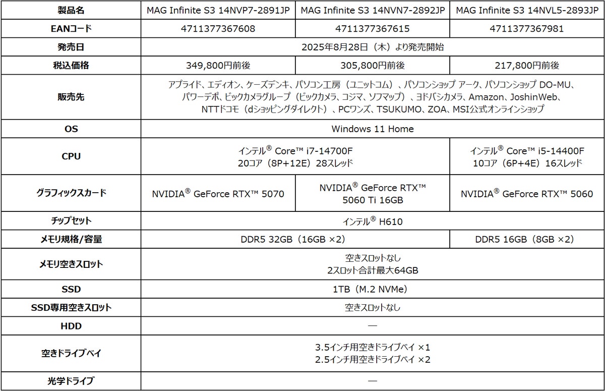 この度、エムエスアイコンピュータージャパン株式会社は2025年8月28日(木)より新たな製品を発売開始します。高いゲーミングスペックを備えた「MAG」シリーズから、最新のRTX 50シリーズを搭載し、ゲーミング用途はもちろんAI・編集用途にも活用でき、RGBライティング機能やシースルーサイドパネルが付属し自分好みのゲーミング環境を構築できる「MAG Infinite S3 14NVP7-2891JP」を含む3製品を新たにラインアップに追加いたします。