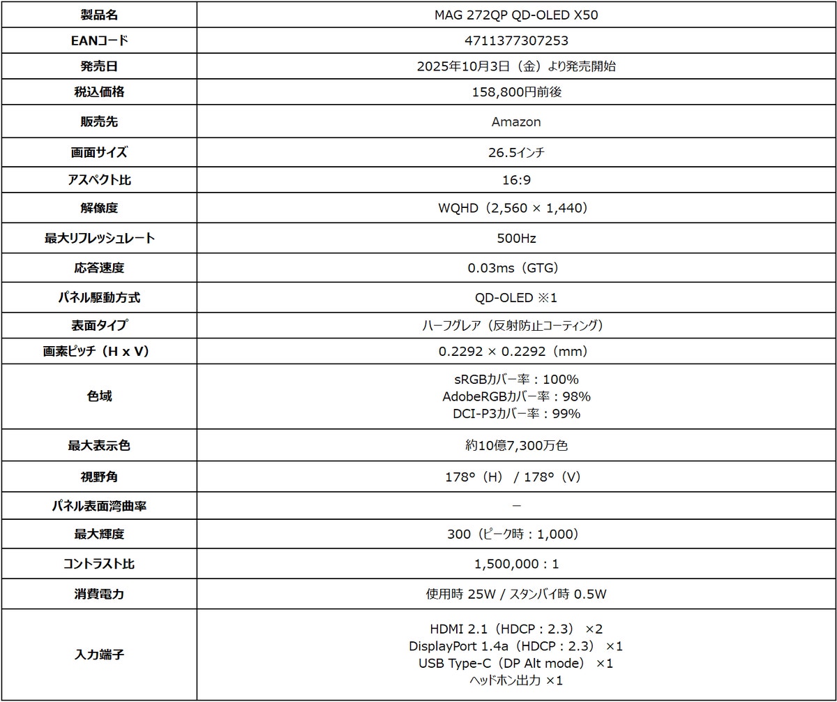 この度、エムエスアイコンピュータージャパン株式会社は2025年10月3日(金)より、ゲーミングモニターの新モデルを発売いたします。高いゲーミング性能とコストパフォーマンスを両立した『MAG』シリーズから、WQHD(2,560 × 1,440)解像度のQD-OLEDパネルを採用し、深い黒と鮮やかな色彩を両立させ、超高速な500Hzのリフレッシュレートと0.03ms(GTG)の応答速度により、滑らかで残像の少ない映像体験を提供する「MAG 272QP QD-OLED X50」が新たにラインアップに加わります。