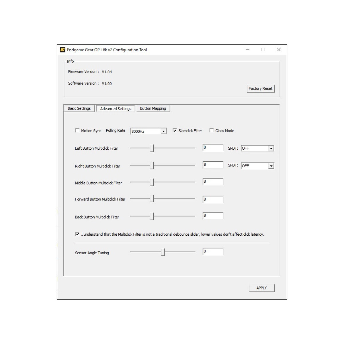 各ボタン設定、メインボタンのモード切替、マルチクリックフィルター、ポーリングレートやLOD設定等が行えるソフトウェアを用意。メーカー公式サイトからダウンロードして使用できる。