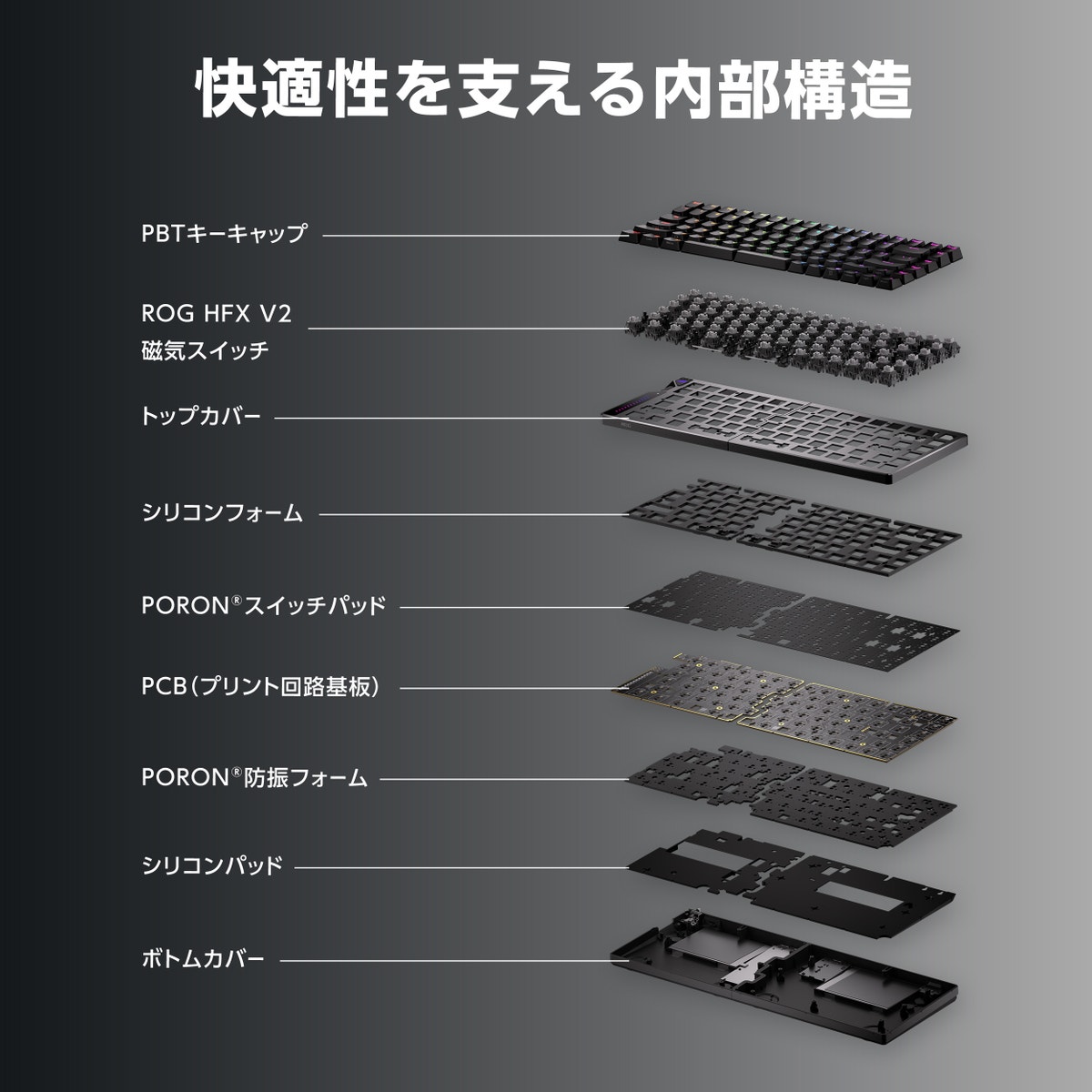 4層構造の吸音設計により、打鍵音を抑えつつ、クッション性のある快適なタイピングを実現します。