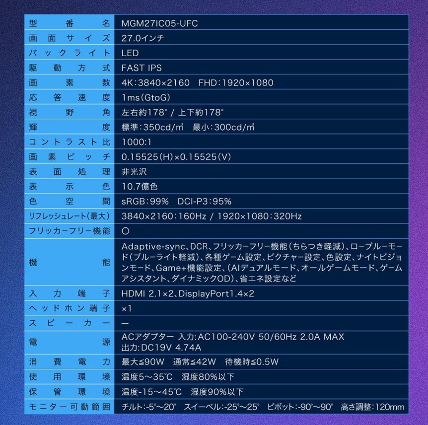 本製品は4K(160Hz)の高画質とフルHD(320Hz)の超高速表示を切り替えられる「デュアルモード」を搭載し、このスペックとしては破格の安さを実現している。