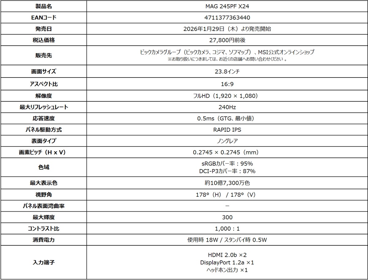 MSIから23.8インチのゲーミングモニター「MAG 245PF X24」を2026年1月29日(木)より発売した。ビックカメラグループおよびMSI公式オンラインショップにて販売される。参考価格は27,800円。