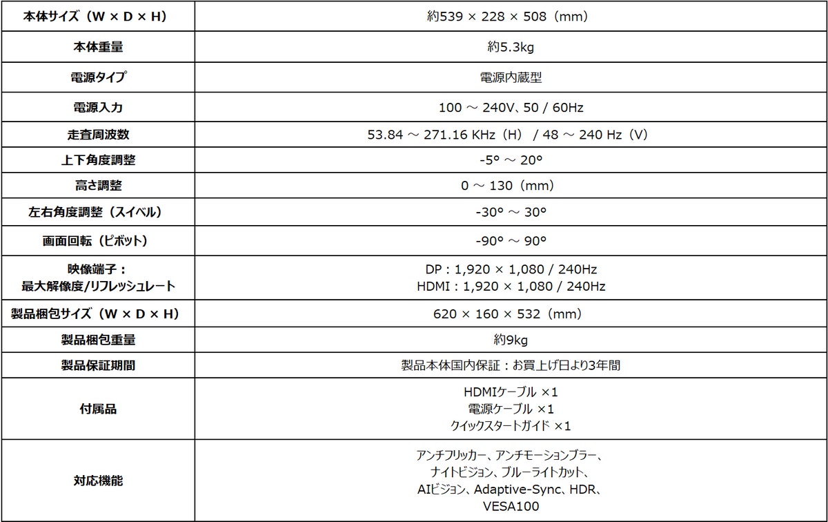 本製品はリフレッシュレート240Hz、応答速度0.5ms(GTG、最小値)の「RAPID IPSパネル」を採用し、暗部補正を行う「AIビジョン」などを備えた競技向けモデルとなっている。