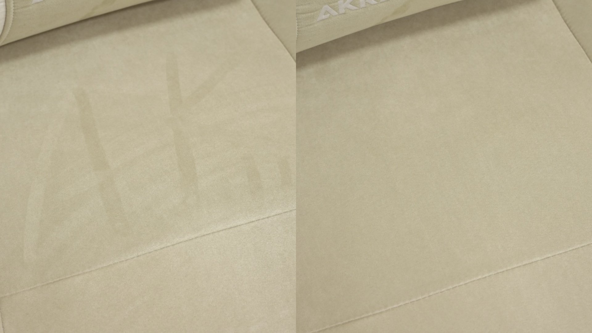 スエード調生地の特徴。左のように手でなぞると毛足が立つが、サッとなでるだけで右のようにきれいになる