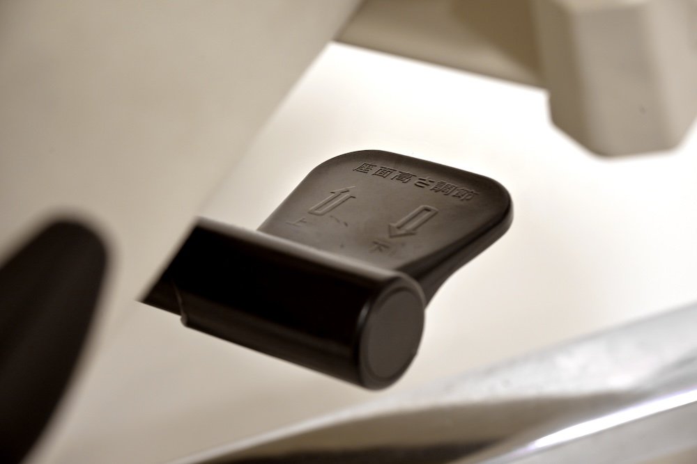 右側には座面の高さ調節レバーを備える