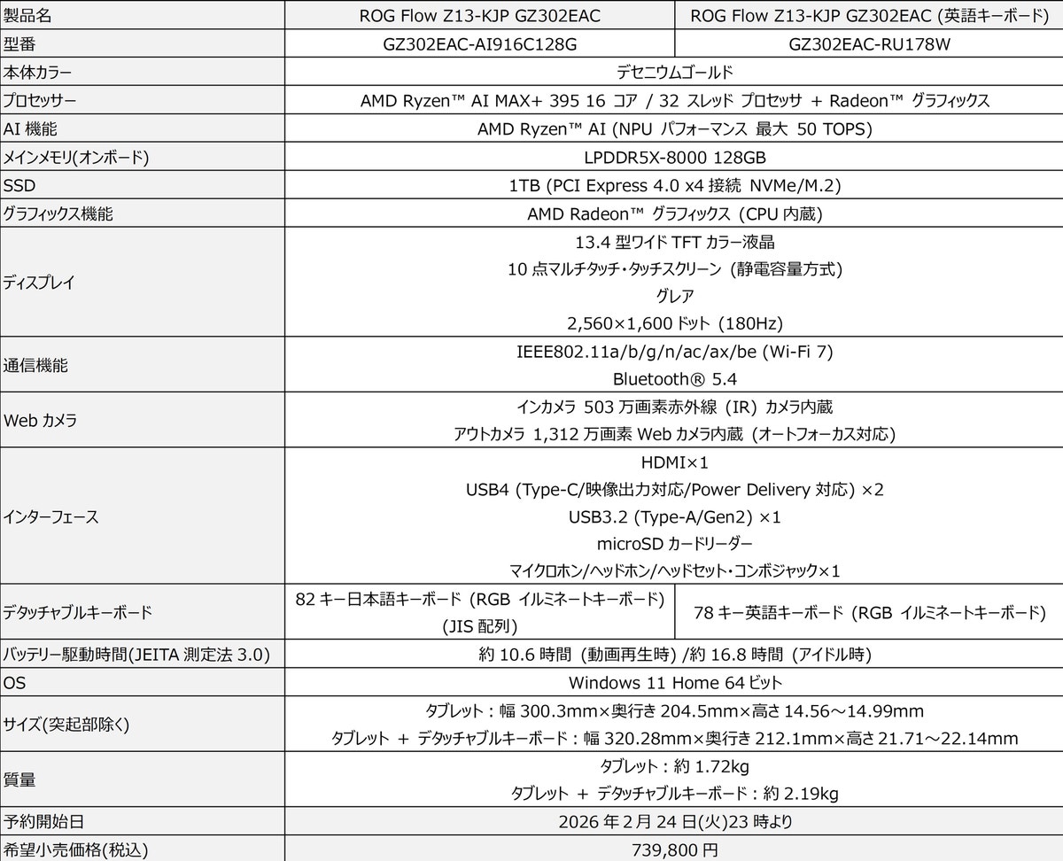 ※今回発表のROG Flow Z13-KJP GZ302EACの詳細スペックはこちらからご確認ください。