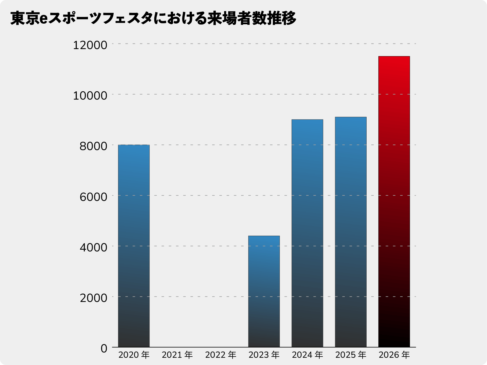 ▲2020年から開催されている「東京eスポーツフェスタ」の来場者数推移。2021年〜22年はコロナ禍ということもあり、オフライン開催はなかったため、来場者数は0。そう考えると直近の3年は横ばい、もしくは微増といった形で来場者数に変化があるのが読み取れる
