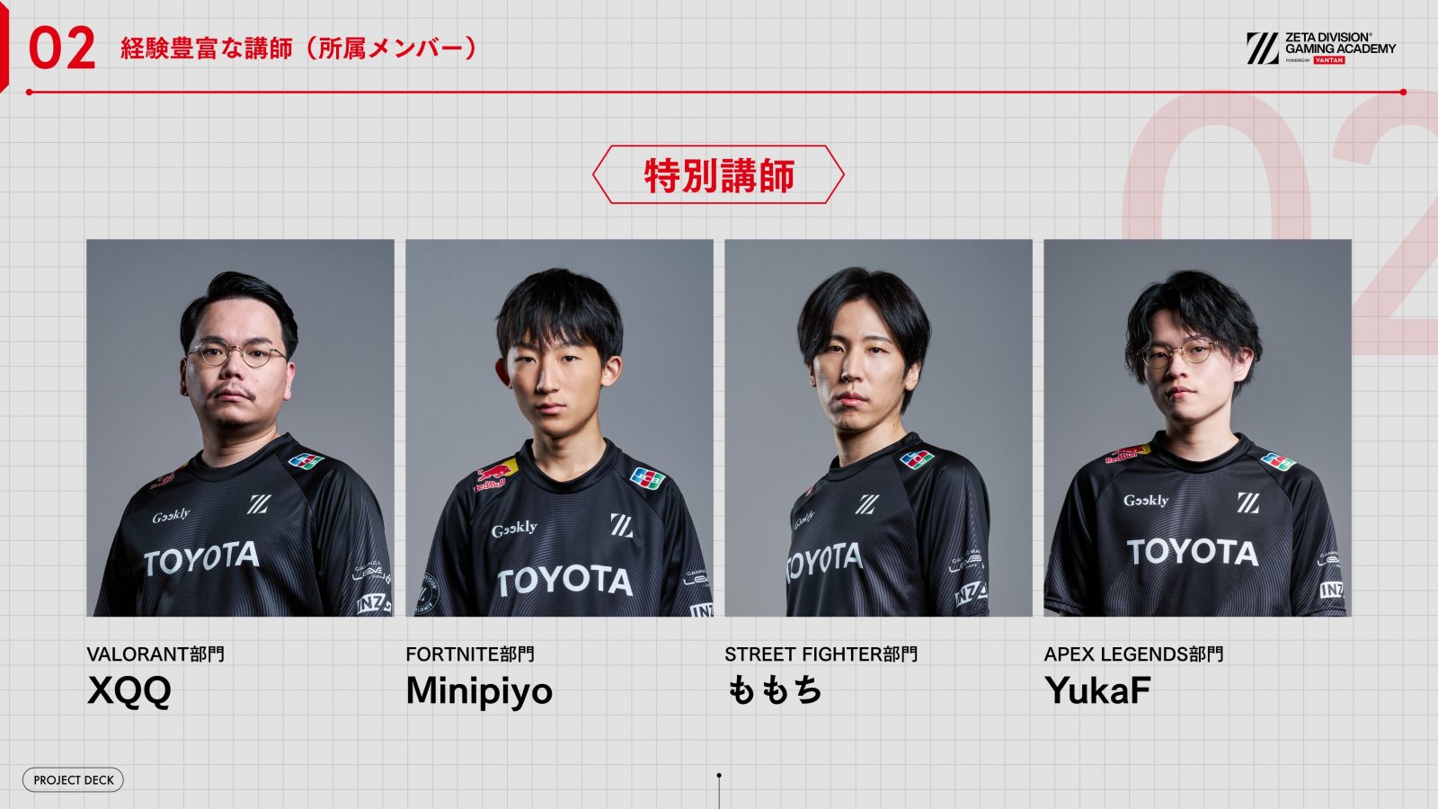 ▲本校ではZETA DIVISION所属のメンバーやGANYMEDE所属の社員などが特別講師として登壇することもあるとのこと。メンバーの中には、Lazやcrowといった世界大会を経験した元プロ選手も名を連ねている。千葉氏によると、さらに特別講師の数は増えるとのこと