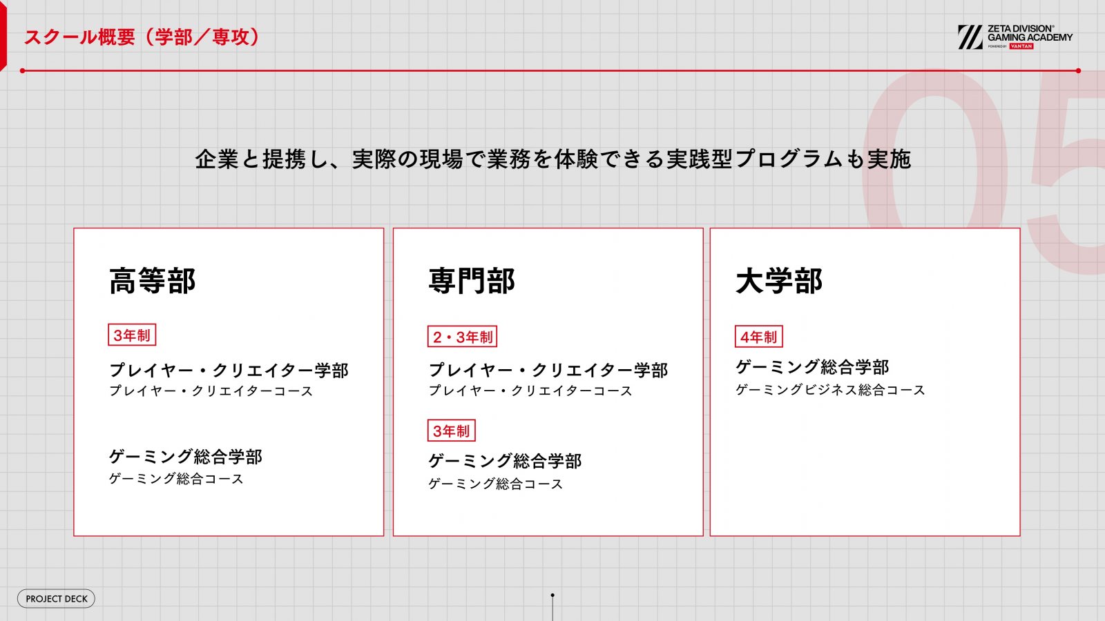 ▲「ZETA DIVISION GAMING ACADEMY powered by VANTAN」は大きく分けて高等部、専門部、大学部の3つの部門に分かれており、提携する通信学校と連携することで、学歴が取得できる道筋も担保されている