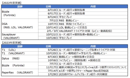 2023年度は、昨年大好評だった「Bizzle」「Dplus」による特別授業を再び開催するとともに「T1」「Paper Rex」といった 今、最も実力を持つチームを招聘しました。学生のプレーへのアドバイス、技術の伝授はもちろん、トッププロチームだから聞けるeスポーツ業界に関するレクチャーや、トライアウト対策、合同練習など充実したプログラムを企画しております。