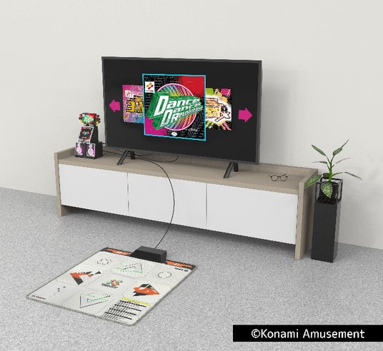 「DanceDanceRevolution Classic Mini」本体に搭載された液晶画面でのプレーはもちろん、TVにHDMIケーブルで接続して映像を出力することができ、大画面でのプレーもお楽しみいただけます。