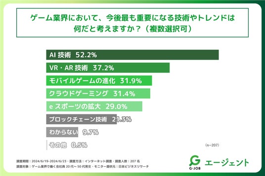 また、「ゲーム業界において、今後最も重要になる技術やトレンドは何だと考えるか」を尋ねる設問への回答では「AI技術」が最も多く52.2%、次いで「VR・AR技術」が37.2%で続く形となりました。VR・AR技術はゲーム開発に生かしやすい技術であると思われますが、それ以上にどの業界も注目している「AI技術」がゲーム業界においても、今後重要になってくると考えている方が多いと判明しました。